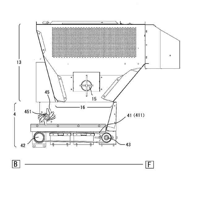 エンジンからの動力は、油圧ポンプを経て送られる。送られた油圧により油圧モータはギアを回転させコンベア駆動チェーンを駆動する。後述するコンベア駆動チェーン421は搬送部4を駆動する。搬送部4へ動力が送られる駆動伝達側面93は、図1の左(L)側の面にあり見えていない。図1の搬送部4が図示されている右(R)側の面は、非駆動伝達側面(従動側の面)である。