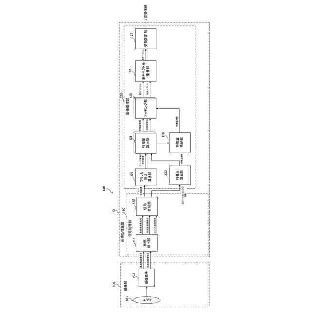 図1は、第1の実施形態に係る画像処理システム130の構成例を示すブロック図である。以下、図面を用いて、第1の実施形態の画像処理システム130について詳細に説明する。画像処理システム130は、撮像部100の姿勢推定を行うために、画素毎にフリッカを検知することでフリッカ形状を算出し、画像信号を用いて算出した特徴点とフリッカ形状画像を重畳して特徴量を算出する。画像処理システム130は、算出した特徴量を用いて、特徴点マッチングを行うことで、撮像部100の姿勢推定する場合における例を説明する。