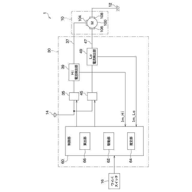 これにより、電動モータ位置検出用のホールICを設けることなく、ワイパ角度が推定される。このため、電動モータ位置検出用のホールICの配線を設ける必要がなくなる。したがって、簡素な構成でワイパ角度θwが推定される。また、ワイパは、第1位置または第2位置の直前から減速されることにより、第1位置または第2位置で滑らかに反転する。これによって、狙った第1位置または第2位置をワイパが行き過ぎることであるワイパのオーバーランが抑制される。