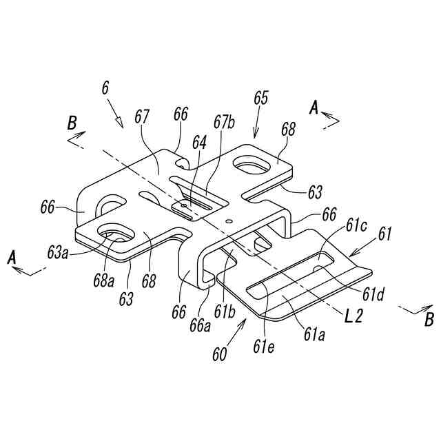前記本発明に係る取付具において、好ましくは、前記摺動係合片は、前記吊下支持部材における前記中心軸を挟んだ幅方向両側端部を、幅方向内側に向けてL字状に折り返すことにより形成されている。このとき、より好ましくは、前記吊下支持部材の幅方向両側端部に形成された前記摺動係合片は、前記中心軸方向において互いに同位置で対向するように、該中心軸に沿って複数且つ同数配されている。また、前記本発明に係る取付具において、好ましくは、前記固定部は、前記取付具における前記中心軸を挟んだ幅方向両側端部にそれぞれ一体に連結されていて、前記中心軸に沿って長い固定穴を有している。