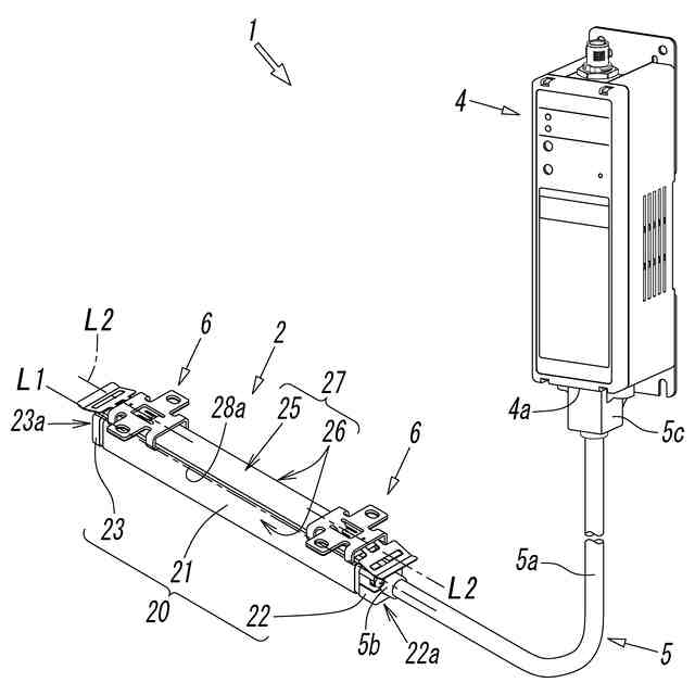 前記取付具は、前記設置部位に固定された固定部と、ロック係合片を備えた軸方向支持部材と、摺動係合片を備えた吊下支持部材とを有しており、
