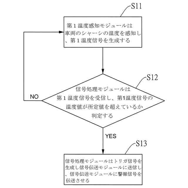 図1を参照すると、図1は本発明の車両温度異常警報システムの実施例1を示すブロック概略図である。車両温度異常警報システム1は駐車枠に設置され、ハウジング11と、第1温度感知モジュール12と、信号処理モジュール13と、信号伝送モジュール14とを備える。第1温度感知モジュール12は、ハウジング11内に設けられ、車両のシャーシの温度を感知し、第1温度信号を生成する。信号処理モジュール13と、信号伝送モジュール14とは何れもハウジング11内に設けられている。信号処理モジュール13は、第1温度感知モジュール12に接続され、第1温度信号を受信し、第1温度信号の第1温度値が所定値を超えているかどうかを判定する。信号伝送モジュール14は、信号処理モジュール13に接続され、警報信号を伝送する。第1温度値が所定値を超えると、信号処理モジュール13はトリガ信号を生成し、信号伝送モジュール14に送信し、信号伝送モジュール14に警報信号を伝送させる。