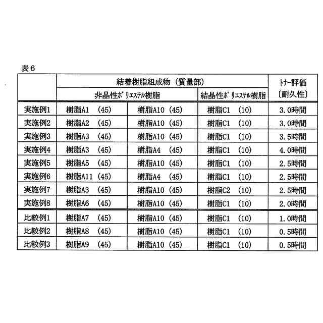 特許文献1に記載のトナーでは、結晶性樹脂として結晶性ポリエステル樹脂が用いられているが、結着樹脂としてはスチレンアクリル樹脂が用いられており、非晶性樹脂として結晶性ポリエステル樹脂と親和性が高い非晶性ポリエステル樹脂が用いられているものの、配合量が少ないため、耐久性が十分とは言えない。加えて、結晶性ポリエステル樹脂の配合量も少なく、低温定着性のために結晶性ポリエステル樹脂を増量した際の耐久性が不十分と考えられる。