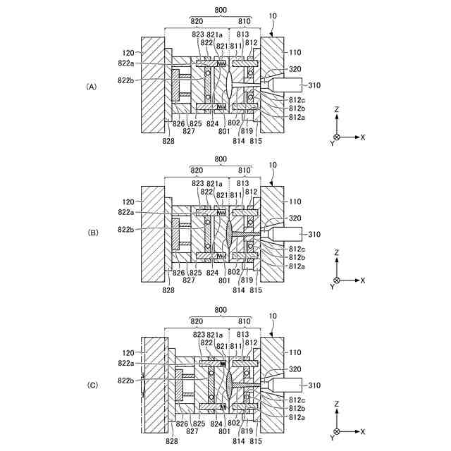 【解決手段】固定金型は、型締時に可動金型に接し、キャビティ空間の壁面の一部を形成する第1型部と、成形材料の充填時における前記第1型部の温度よりも低い温度に温度調節される第1冷却部と、前記第1冷却部と前記第1型部の一方を他方に対して相対的に移動可能に支持する第1支持部と、有する。前記第1冷却部と前記第1型部は、互いに離隔する位置と互いに接触する位置との間で、型開方向と型閉方向の両方向に相対的に移動可能である。