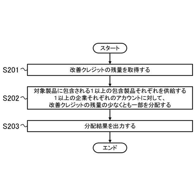 前記対象企業の属するサプライチェーンにおける、前記対象企業の対象製品を含む製品群の供給関係を階層的に示す製品ツリーを辿ることで特定される、前記対象企業の対象製品に1以上上流側の製品として包含される1以上の包含製品それぞれを供給する1以上の企業それぞれのアカウントに対して、取得された前記改善クレジットの残量の少なくとも一部を分配すること、