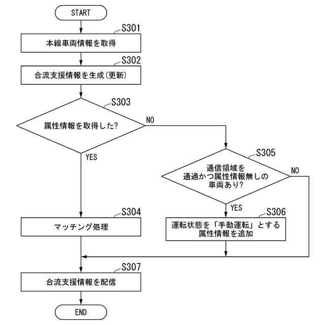 前記本線通信装置の通信領域を通過済みであり、前記属性情報が関連付けられていない本線車両がある場合に、当該本線車両の運転状態を手動運転とした属性情報を生成して前記合流支援情報に追加する、