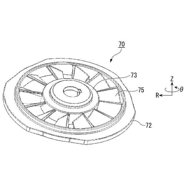 前記カムリングおよび前記ハブに接続され、前記軸方向に対して垂直以外の角度で交差し、前記周方向に隙間を置いて配置される複数の羽根板と、を有する、