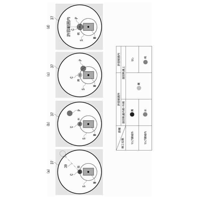 さらに、前記実杭芯位置を示すアイコンは、前記実杭芯位置が前記杭の施工位置へ移動する途中で、表示色を切り替え前の色から特定の色に段階的に変化させ、前記特定の色は、前記杭の施工位置が前記杭打機の周辺領域の外から内に入ったときに変化する色と、前記杭打機の周辺領域内にある前記杭の施工位置が前記旋回軌道上に位置したときに変化する色と、前記杭打機の周辺領域内にある前記杭の施工位置が前記実杭芯位置と重なるときに変化する色と、が含まれることを特徴としている。