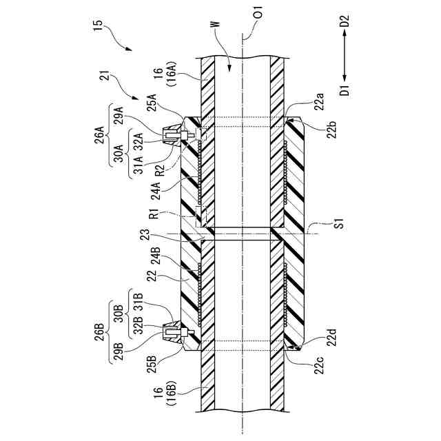 (3)本発明の態様3は、筒状に形成されて、前記継手本体から径方向外側に向かって突出し、前記端子を囲う保護部材を備え、前記保護部材の外径は、前記軸線に近づくに従い漸次大きくなる、(1)又は(2)に記載の電気融着継手であってもよい。