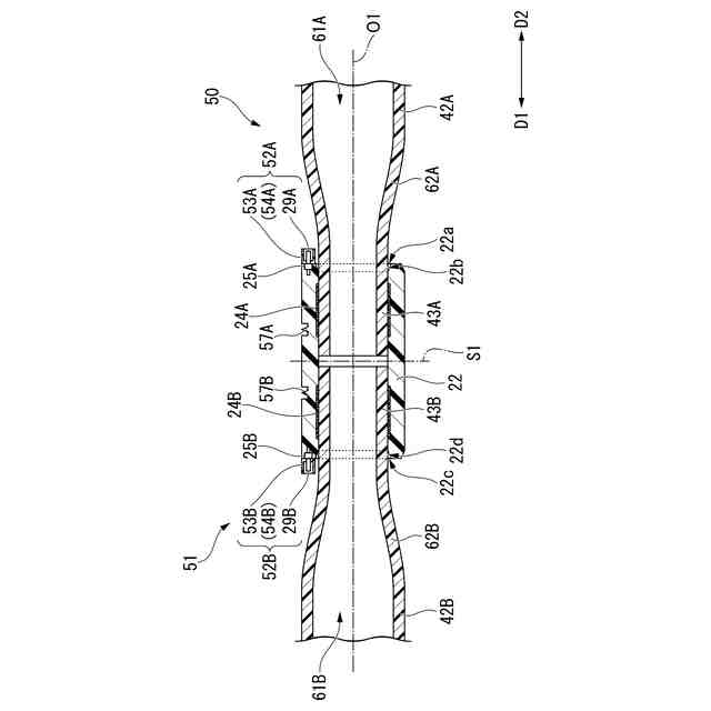 前記軸線方向において、前記電線よりも前記第1端部寄りの前記継手本体に配置され、前記電線の両端部に着脱可能な2つの端子と、