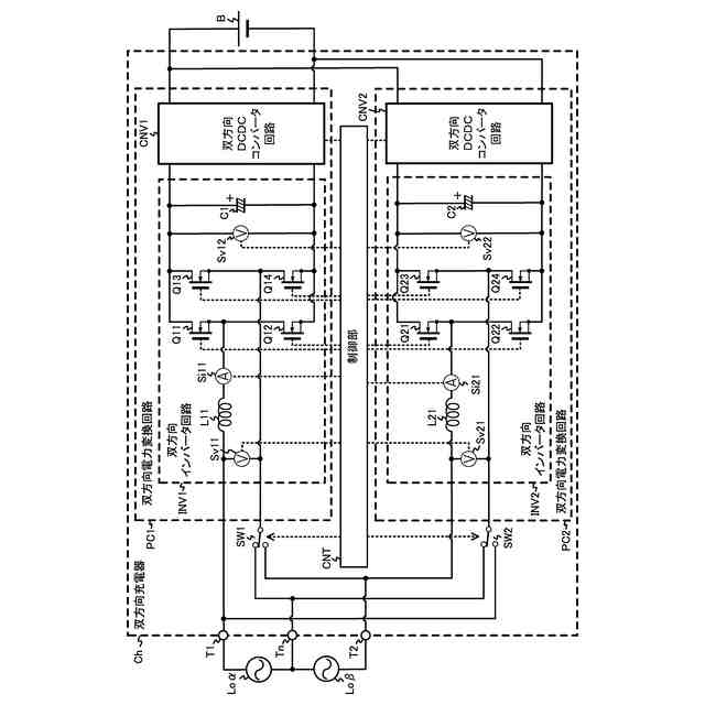 双方向充電器として、2つの双方向電力変換回路を備えるものがある。バッテリの充電時、各双方向電力変換回路は、商用電源からホット側の電圧線及びコールド側の電圧線を介して供給される交流電力を直流電力に変換してバッテリに出力する。単相三線式の電力供給時、一方の双方向電力変換回路は、バッテリから供給される直流電力を交流電力に変換してホット側の電圧線及びグランド側の中性線を介して一方の負荷に出力し、他方の双方向電力変換回路は、バッテリから供給される直流電力を交流電力に変換してコールド側の電圧線及び中性線を介して他方の負荷に出力する。関連する技術として、特許文献1がある。