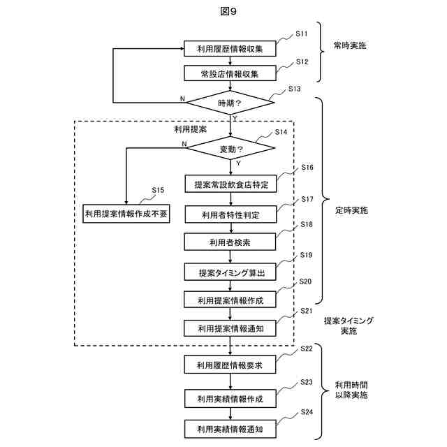 より具体的には、飲食店の利用を提案する飲食店提案装置において、前記飲食店は施設に入居する常設飲食店であり、前記常設飲食店に関する常設店情報を記憶する記憶部と、前記施設の影響領域に出店された非常設飲食店の利用状態を示す利用履歴情報を収集する利用履歴情報収集部と、前記利用履歴情報および前記常設店情報に基づいて、前記非常設飲食店の利用者に対する、前記常設飲食店の利用を提案する利用提案情報を作成する利用提案部を有する飲食店提案装置である。