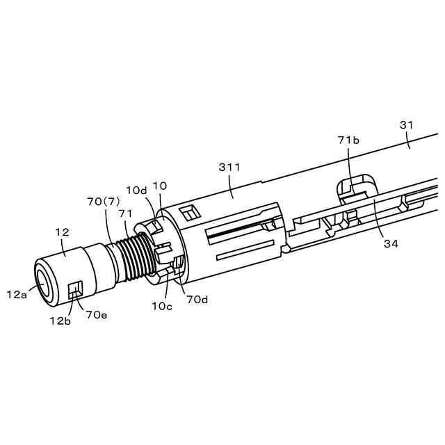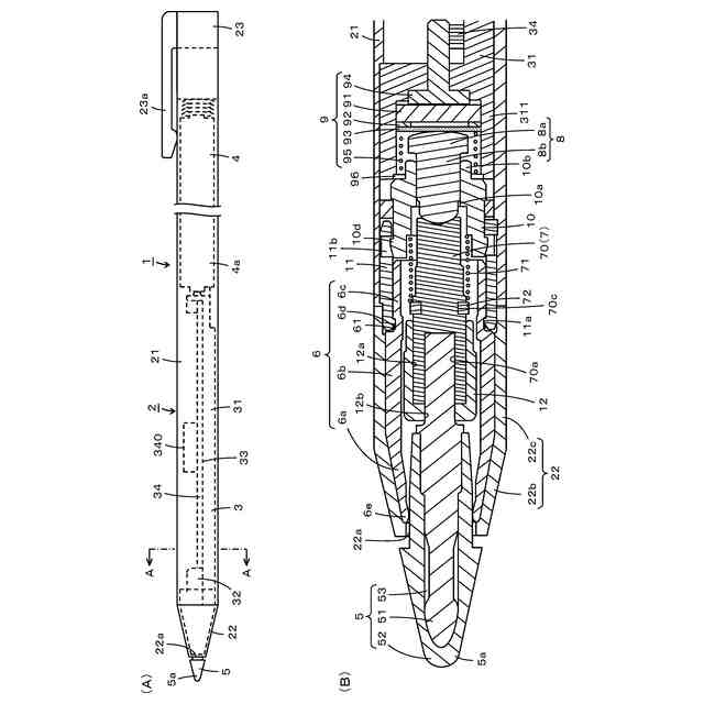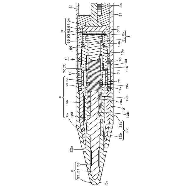 【解決手段】導電性を備える芯体と、芯体の先端部とは反対側の後端部が嵌合される嵌合凹部を備え、芯体と電気的に結合される芯体ホルダーとを備える。芯体ホルダーは、導電性樹脂で構成され、嵌合凹部を備え、芯体と電気的に結合される導電性シャフト部材で構成されている。導電性シャフト部材に一端側が電気的に接続され、他端側が回路基板に電気的に接続される電気的接続部材を備える。