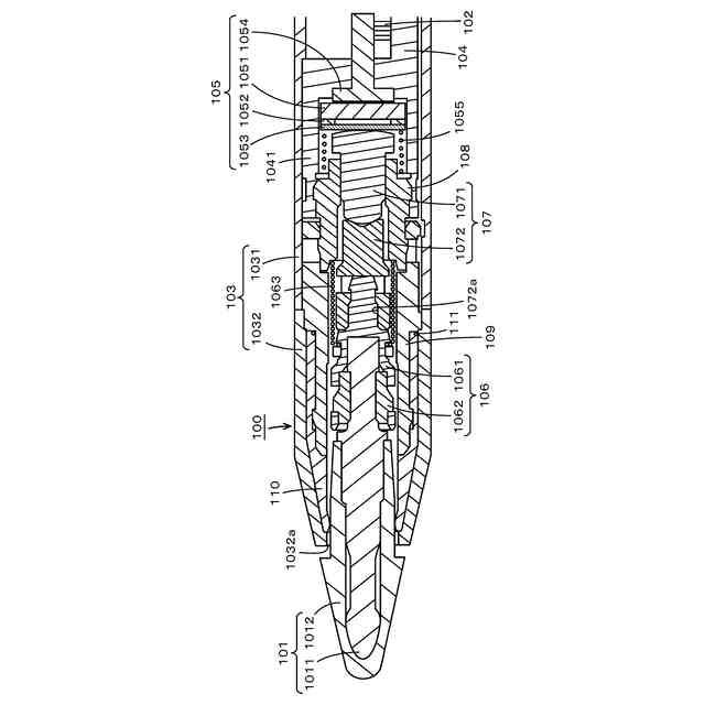 この例では、圧力検出部105の導電性弾性部材1053は、芯体101の先端部に印加される圧力(筆圧)を、芯体ホルダー106及び圧力伝達部材107を介して受けるように構成されている。
