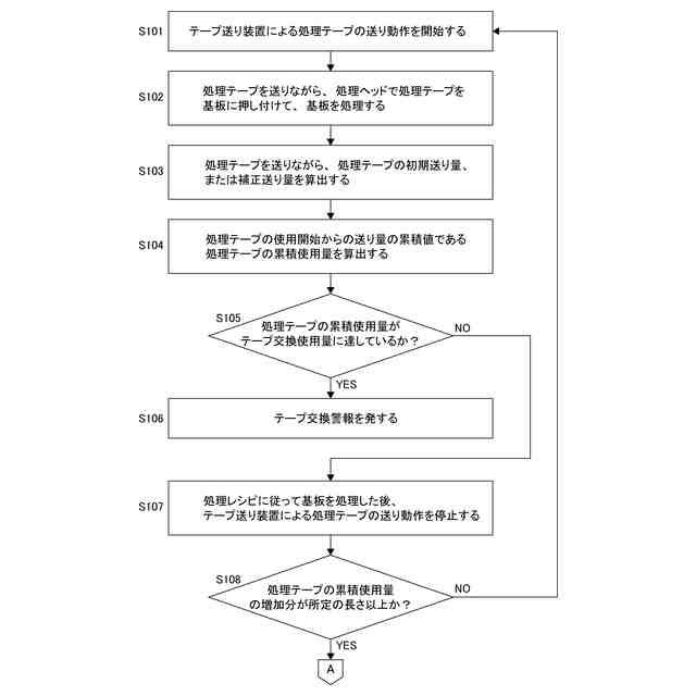 一態様では、前記テープ送りローラーの直径の前記減少量を決定することは、前記テープ送りローラーの回転回数と、前記テープ送りローラーの直径に基づいて、前記処理テープの送り量を算出し、前記処理テープを前記処理ヘッドに供給するテープ巻き出しリールの回転回数と、前記テープ巻き出しリール上の前記処理テープの巻体の外径に基づいて、前記処理テープの巻き出し量を算出し、前記処理テープの送り量と、前記処理テープの巻き出し量との差に基づいて、前記テープ送りローラーの直径の前記減少量を算出することを含む。
