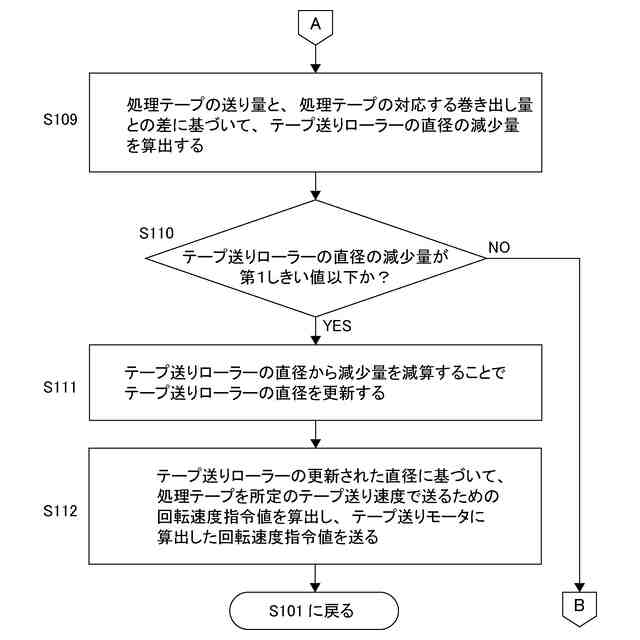一態様では、前記処理テープの使用開始からの前記処理テープの累積使用量の増加分が所定の長さ以上であるときに、前記テープ送りローラーの直径の前記減少量を決定する。