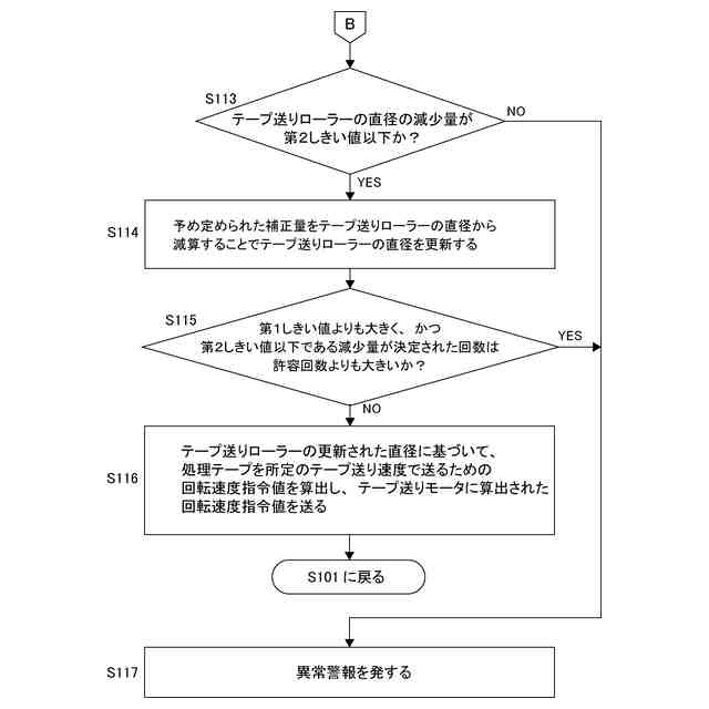 一態様では、前記テープ送りローラーの直径の前記減少量を決定することは、前記テープ送りローラーの回転回数と、前記テープ送りローラーの直径に基づいて前記処理テープの送り量を算出し、前記処理テープに等間隔に付された複数のテープマークをテープマーク検出センサにより検出し、前記検出されたテープマークの数をカウントして、前記処理テープの巻き出し量を算出し、前記処理テープの送り量と前記処理テープの巻き出し量との差に基づいて、前記テープ送りローラーの直径の前記減少量を算出することを含む。