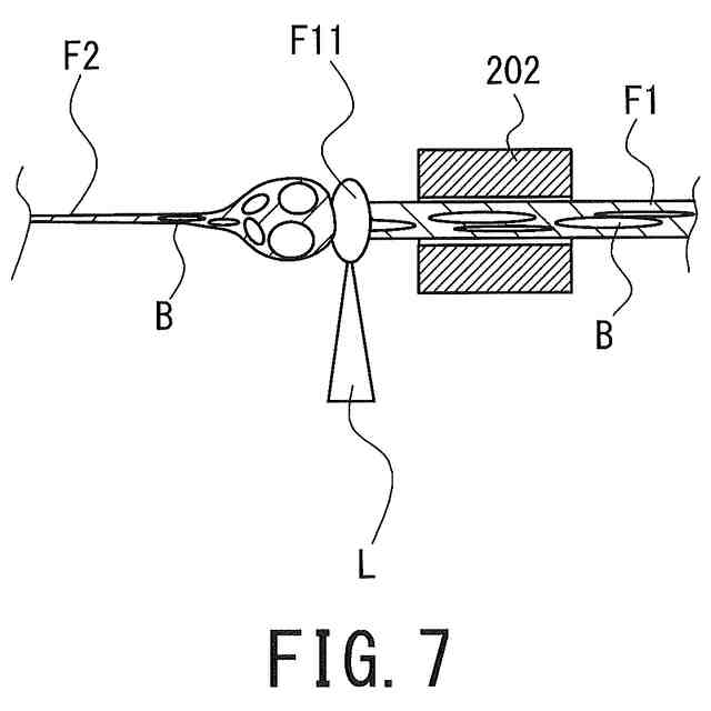 以上の張力で延伸している。これにより、発泡を起こし、糸切れを起こりにくくしている。