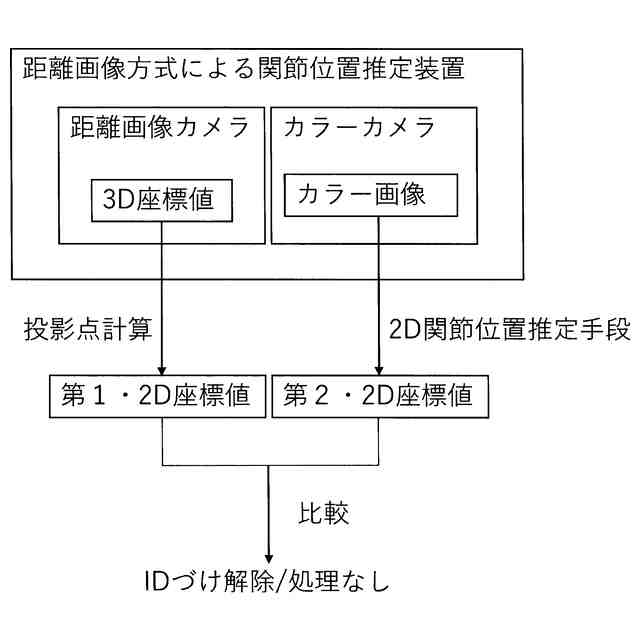 近年、マーカや慣性センサを用いることがない、いわゆるマーカレス・モーションキャプチャが登場している。マーカレスの関節位置取得手法としては、距離画像(深度画像)を取得し、取得した1枚の深度画像から関節位置を推定する手法(非特許文献1)や単一のRGB画像から人間の姿を見つけ関節位置の確からしさを表すヒートマップを生成することで関節位置を推定する手法が知られている。前者については、Kinect(非特許文献2)に代表されるように、距離画像方式を採用した比較的安価なモーションキャプチャが市場に登場しており、後者については、OpenPose(https://github.com/CMU-Perceptual-Computing-Lab/open)やVisonPose(https://www.next-system.com/visionpose)が知られている。本出願人は、これらの手法を組み合わせて用いた関節位置取得装置及び方法を提案している(特許文献1)。