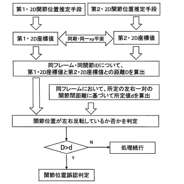 関節位置として第1・2D座標値を推定する第1・2D関節位置推定手段と、関節位置として第2・2D座標値を推定する第2・2D関節位置推定手段と、を備え、第1・2D座標値と第2・2D座標値は、共通のXY平面上の値として同期して得られており、同フレーム・同関節IDについて、第1・2D座標値と第2・2D座標値との距離Dを算出する手段と、距離Dが所定値dよりも大きい時に、当該関節位置が左右反転していると判定する判定手段と、を備え、所定値dは、同フレームにおける所定の左右一対の関節の2D座標間距離に基づいて決定される。