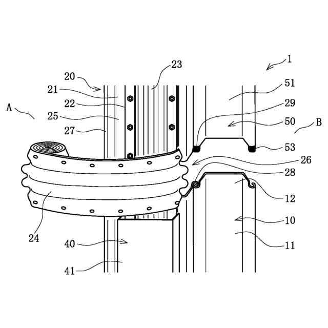 左右方向の前記可撓継手は、両側から巻き戻して互いの端縁部を中央部に向けて上側および下側の取付け部材に取り付けて行き、中央端縁部同士は薄肉成形部を形成して重ねて貼り合わせるとともに、締結部材により締め付ける挟み込み部材で取付け部材へ取り付けて構築する、