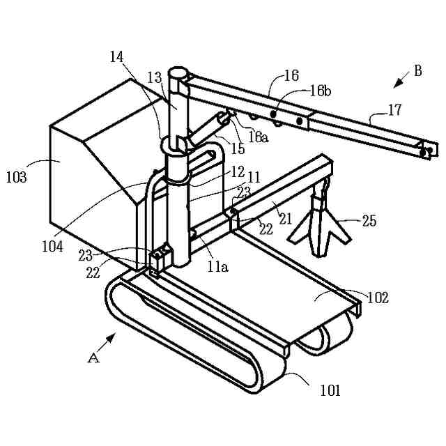 【解決手段】1対のキャタピラで走行する石材運搬車Aに取り付け、取り外し、折り畳みが可能なクレーンBであって、石材運搬車Aの進行方向に対して横方向に動かすことができるアウトリガ21を備える。クレーンBの固定支柱11の下端部は切り欠き状になっていて、ここにアウトリガ21を通し、固定支柱11の下端部に固着した外れ止め金具11aの挿入孔からアウトリガ21に設けた挿入孔21aに落込み棒11cを落し込むので、固定支柱11とアウトリガ21とが固定される。固定支柱11に挿通される回転支柱13の下方に設けられた方向決めピンが、固定支柱11に固定されている方向転換具14のピン孔に挿入されると、回転支柱13の上部と連結するブーム16の位置が定まる。