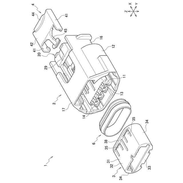 図1~図4に示すように、コネクタ1は、ハウジング2と、フロントホルダ3と、嵌合検知部材4と、シール部材6とを備える。本実施形態において、コネクタ1は、前後方向に沿って相手コネクタ101(図19~図23参照、オスコネクタ)と嵌合可能に構成されるメスコネクタである。