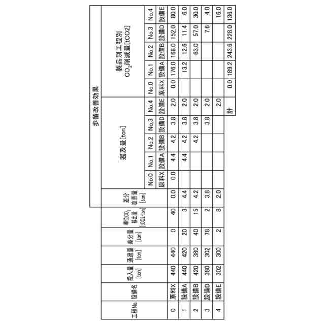 当該工程における、前記工程の歩留り改善による改善量を当該工程の改善量として求め、当該工程から上流側の工程ごとに工程の単位量当たりのCO