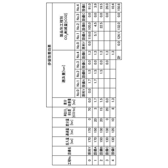 削減量を求める第2削減量演算部とを備える。好ましくは、上述の二酸化炭素排出量演算システムにおいて、前記工程は、設備によって実施され、設備種類の異なる設備によって実施される工程は、工程種類が異なり、工程の歩留り改善は、設備の歩留り改善と同意であり、製品別工程別CO