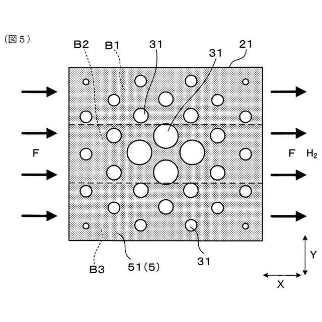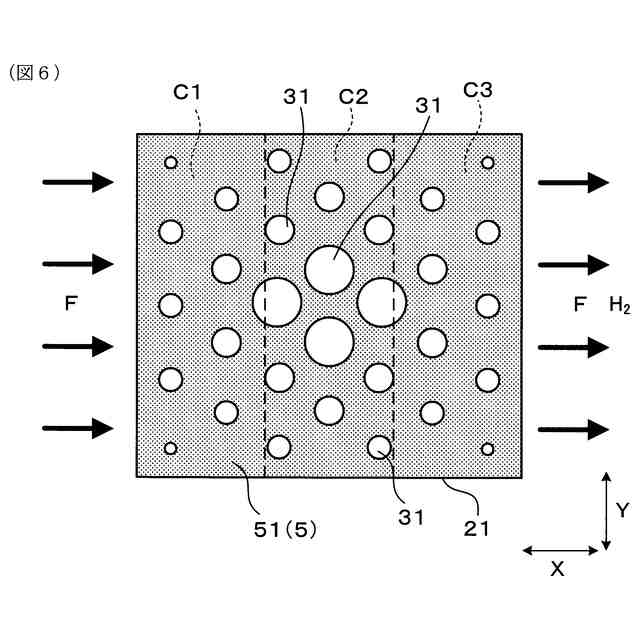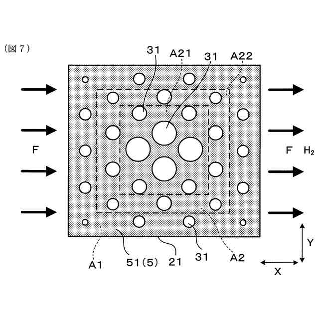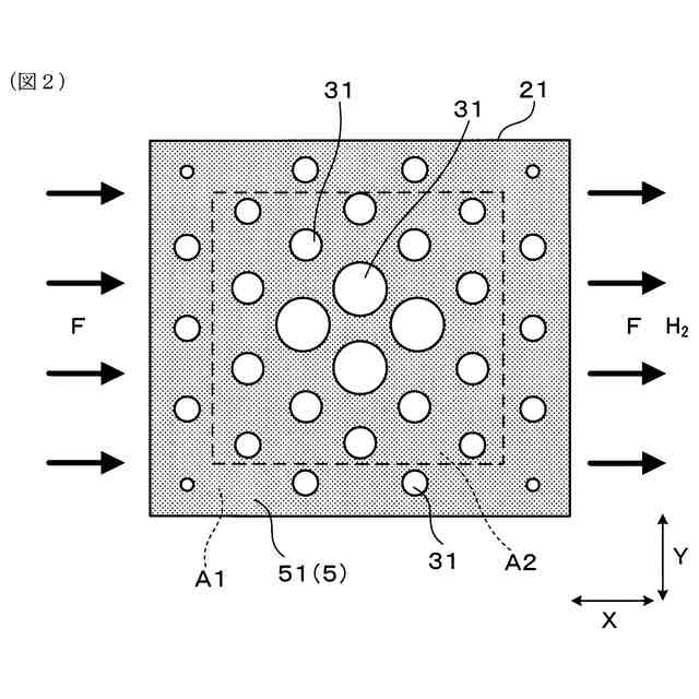 燃料電池や水素生成デバイス等を構成する電気化学セルスタックにおいては、電解質層の一方の面と他方の面とに、それぞれ電極が設けられている。そして、例えば、燃料電池においては、一方の電極に燃料が供給され、電極において電気化学反応を生じさせることで、発電が行われる。特許文献1に記載の燃料電池においては、複数の開口孔を備えた金属プレートが、セルにおける上記一方の電極側を支持しており、当該開口孔から燃料が電極へ供給されるよう構成されている。また、開口孔の形成密度(すなわち開口率)が、全面にわたり均一となっている。