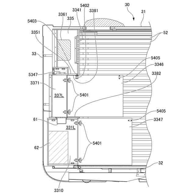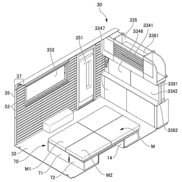 【解決手段】室内空間を有するトレーラー1であって、室内空間を形成する側壁には、内側蓋部により塞がれる開口を有する室内収納空間が形成され、内側蓋部は、室内収納空間の開口の一部分に対する開口の他の部分を閉塞可能であり、開口の一部分と、開口の一部分に対する開口の他の部分と、を区画するパーテーション用蓋部3346を有し、開口の一部分に対する開口の他の部分を有する室内収納空間の部分には、流し台61が設けられるトレーラー1である。