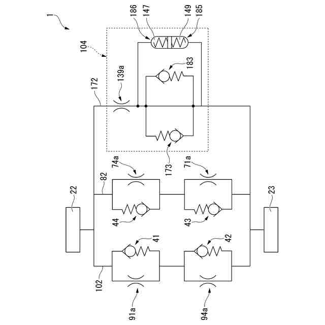 本発明に係る第1実施形態の緩衝器の要部を示す油圧回路図である。