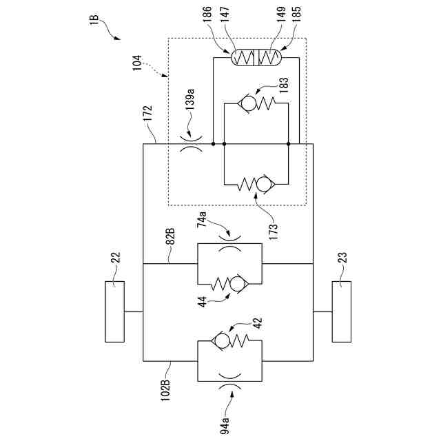 本発明に係る第2実施形態の緩衝器の要部を示す油圧回路図である。