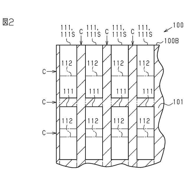 図1に示すように、積層体100は、概ね四角形板状である。したがって、積層体100は、主面100Aと、端面100Bと、を有する。なお、「主面」とは、板状の物体の外表面を構成する平面のうちで、最も面積の大きい平面のことをいう。積層体100の一辺の長さは、例えば10センチメートル以上である。積層体100の厚みは、例えば数ミリメートル程度である。