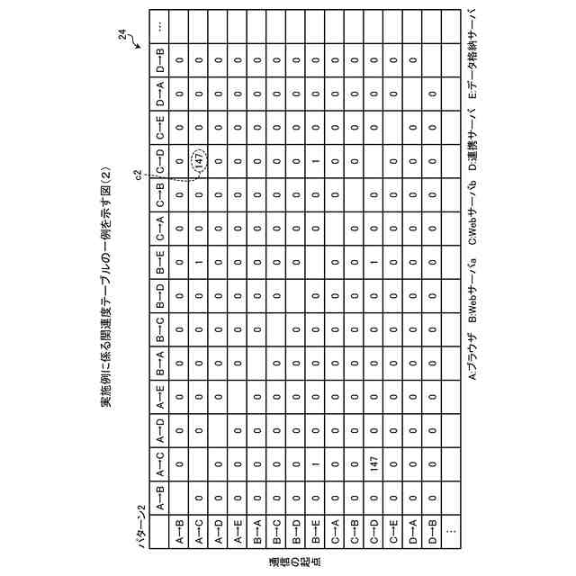 前記関連度情報を生成する処理は、前記第一の情報に含まれるそれぞれの前記通信メッセージについて、前記第二の情報から、前記通信メッセージの発生時刻に近似する時刻の前記第一の通信および前記第二の通信を選択し、選択された前記第一の通信から選択された前記第二の通信への通信回数を示す前記関連度情報であって前記通信メッセージが分類された通信パターンに対応する前記関連度情報を生成する