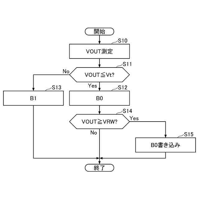 前記読出回路は、前記ビット線の電圧または電流が、第1閾値に仕切られた第1範囲及び第2範囲のうち前記第1範囲内のとき前記書き込まれたデータを第1ビットと判定し、前記ビット線の電圧または電流が前記第2範囲内のとき前記書き込まれたデータを第2ビットと判定し、