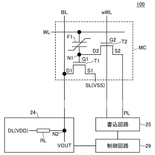 【解決手段】記憶回路100は、第1電源VSSに接続された第1端子S1と、ビット線BLに接続された第2端子D1と、制御端子G1と、を有するトランジスタT1と、一端がトランジスタT1の制御端子に接続され、他端がワード線WLに接続された強誘電体キャパシタF1と、強誘電体キャパシタの一端と他端との間に書き込み電圧を印加することで、強誘電体キャパシタにデータを書き込む書込回路と、ビット線から強誘電体キャパシタに書き込まれたデータを読み出す読出回路24と、を備え、読出回路は、ビット線の電圧又は電流が、第1範囲内のとき書き込まれたデータを第1ビットと判定し、ビット線の電圧又は電流が第2範囲内のとき書き込まれたデータを第2ビットと判定し、書込回路は、ビット線の電圧又は電流が、第3範囲内のとき、強誘電体キャパシタに第1ビットを書き込む。