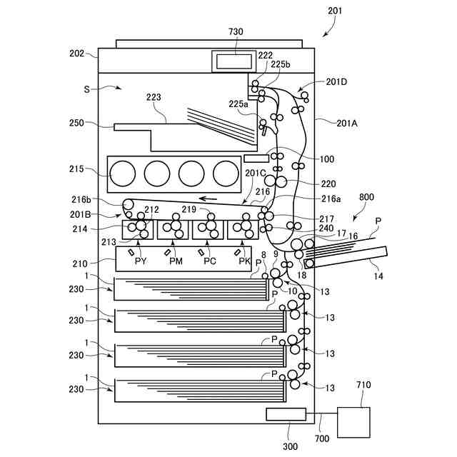 以下、本発明を実施する実施形態について説明する。まず、本実施形態の画像形成装置について、図1を用いて説明する。図1は、本実施形態の画像形成装置201を示す概略図である。例えばプリンタからなる画像形成装置201の装置本体201Aには、シートに画像を形成する画像形成部201Bが搭載され、装置本体201Aの上方には画像読取装置202が略水平に設置されている。画像読取装置202と装置本体201Aとの間には、シート排出用の排出空間Sが形成されている。