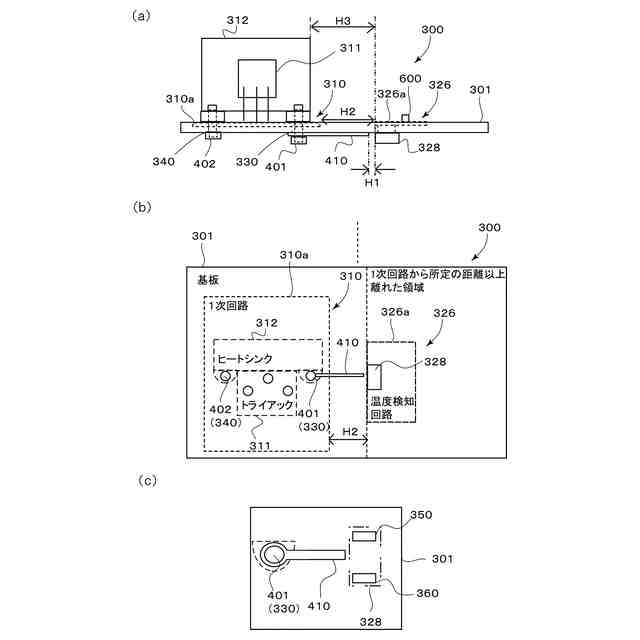 【解決手段】ヒートシンク312の熱を伝導する熱伝導部材410が、基板301に配置される。熱伝導部材410は、交流電圧と直流電圧による電気的な影響を抑制するために間隔を空けて基板301上に配置された1次回路310と2次回路320よりも短い間隔で、サーミスタ328に近接する位置まで、ヒートシンク312からサーミスタ328に向けて形成されている。熱伝導部材410はヒートシンク312の熱を大きなロスなく伝導することから、温度検知回路326はサーミスタ328により熱伝導部材410の熱を検知することで、ヒートシンク312の温度を適切に検知できる。