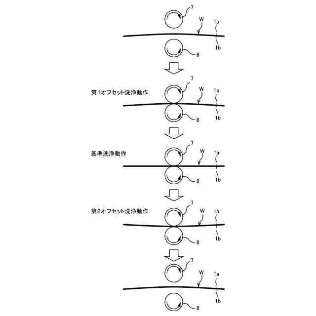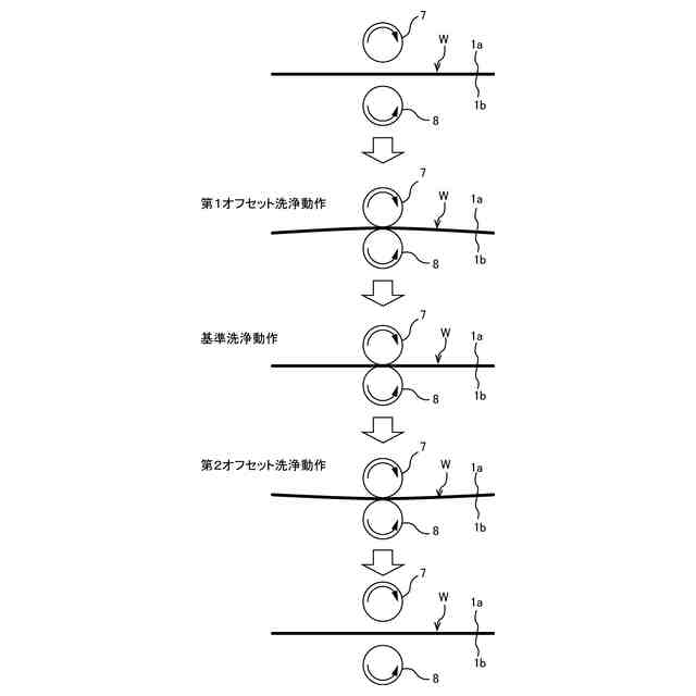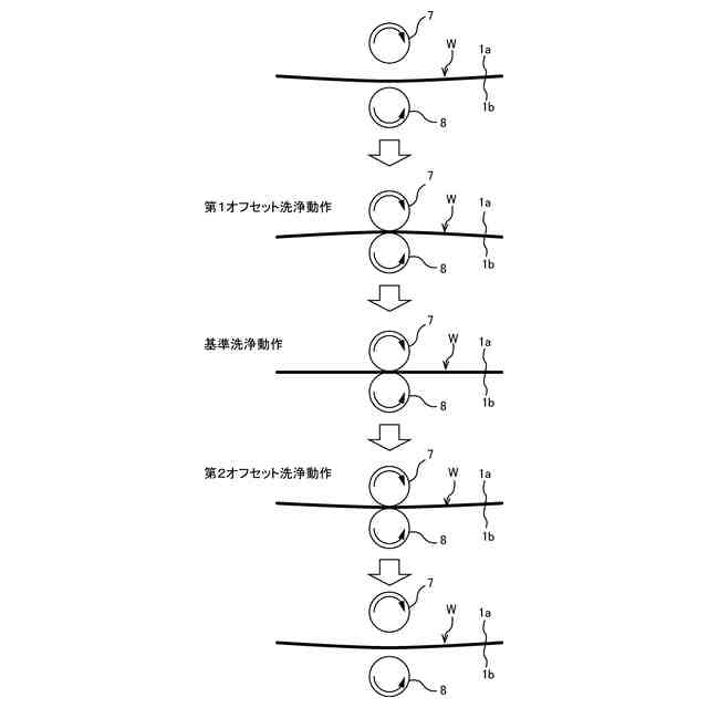 【解決手段】ウェーハWのスクラブ洗浄動作は、基準洗浄位置にある第1ロール洗浄部材7および第2ロール洗浄部材8でウェーハWをスクラブ洗浄する基準洗浄動作と、基準洗浄位置から第1ロール洗浄部材7に向かう方向にずれた第1オフセット洗浄位置にある第1ロール洗浄部材7および第2ロール洗浄部材8でウェーハWをスクラブ洗浄する第1オフセット洗浄動作と、基準洗浄位置から第2ロール洗浄部材8に向かう方向にずれた第2オフセット洗浄位置にある第1ロール洗浄部材7および第2ロール洗浄部材8でウェーハWをスクラブ洗浄する第2オフセット洗浄動作を含む。