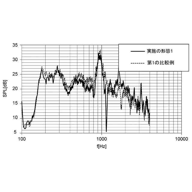 実施の形態1に係る遠心送風機と第1の比較例に係る遠心送風機とにおける、周波数と騒音値の実機試験結果を表す図である。