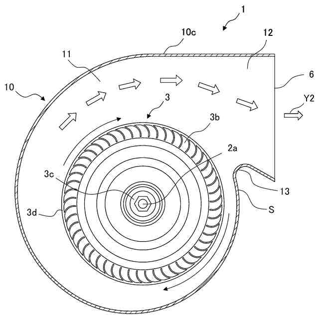 遠心送風機は、効率的に空気流を発生させられることに加え、静圧も確保することができる。このため、ダクト用換気扇等をはじめとする各種換気機器に幅広く搭載されている。こうした換気機器は、遠心送風機の吸込口側に使用者がいるケースが多い。例えば、換気機器が吸込口を下にして部屋の天井に設置されている場合、この部屋で生活する使用者が吸込口の下にいるケースがこれに該当する。このようなケースでは、遠心送風機の内部で発生した騒音が吸込口から直接使用者に伝播することになるので、特に、吸込口側の騒音対策が重要となっている。