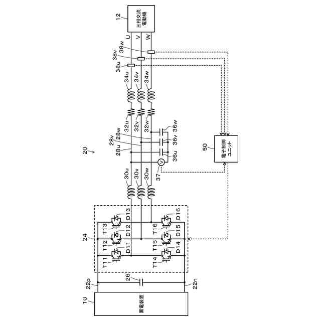 本開示を実施するための形態(実施形態)について図面を参照しながら説明する。図1は、本開示の実施形態の電力システム20の概略構成図である。図示するように、実施形態の電力システム20は、電圧源としての蓄電装置10からの直流電力を三相交流電力に変換して三相負荷としての三相交流電動機12に供給する装置として構成されており、インバータ24と、コンデンサ26と、電子制御ユニット50とを備える。蓄電装置10は、AC/DCコンバータなどを介して電力系統と連携されたり、電力系統との連携が解除されたりする。三相交流電動機12は、回転子および固定子を有し、三相交流により駆動される。