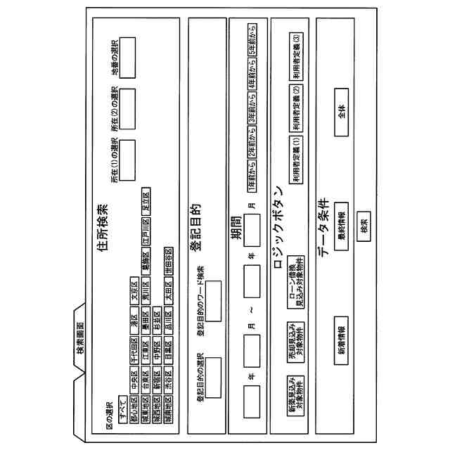 上記課題を解決するために、本発明に係る不動産登記申請情報検索装置は、登記申請の受付年月日を示す情報と、登記申請された不動産の位置を特定するための情報と、登記の目的を示す情報と、登記申請された不動産の用途を示す情報と、に対応付けられた登記申請情報を記憶する登記申請情報記憶手段と、固定金利期間から変動金利への移行が発生する際の不動産住宅ローンの借換えが発生する可能性がある不動産の検索指示を受付けるローン借換え検索入力受付け手段と、前記固定金利期間から前記変動金利への移行に対応する不動産住宅ローンの借換えが発生する可能性のあるローン借換え発生期間を取得するローン借換え発生期間受付け手段と、予め記憶された金利固定期間、または、入力されることにより取得される金利固定期間と、前記ローン借換え発生期間とに基づいて、不動産住宅ローンが開始した期間を示すローン開始期間を算出するローン開始期間算出手段と、前記検索指示に基づいて、第1の条件、第2の条件、及び、第3の条件のいずれにも合致する物件であるローン借換え見込み対象物件を抽出するローン借換え見込み対象物件検索手段と、を有し、前記第1の条件は、前記登記の目的を示す情報に新規を示す情報が含まれ、前記不動産の用途を示す情報に家屋を示す情報が含まれる登記申請情報が前記登記申請情報記憶手段に存在する物件であるとの条件であり、前記第2の条件は、前記登記の目的を示す情報に抵当権設定を示す情報が含まれる登記申請情報が前記登記申請情報記憶手段に存在し、当該登記申請情報よりも受付年月日が後である前記登記の目的を示す情報に抹消を示す情報が含まれる登記申請情報が前記登記申請情報記憶手段に存在しない物件であるとの条件、前記登記の目的を示す情報に抵当権設定を示す情報が含まれる登記申請情報が前記登記申請情報記憶手段に存在し、前記登記の目的を示す情報に根抵当権設定を示す情報が含まれる登記申請情報が前記登記申請情報記憶手段に存在しない物件であるとの条件、又は、前記登記の目的を示す情報に抵当権設定を示す情報が含まれる登記申請情報が前記登記申請情報記憶手段に存在し、当該登記申請情報よりも受付年月日が後である前記登記の目的を示す情報に抹消を示す情報が含まれる登記申請情報も、前記登記の目的を示す情報に根抵当権設定を示す情報が含まれる登記申請情報も、前記登記申請情報記憶手段に存在しない物件であるとの条件、のいずれかであり、前記第3の条件は、前記登記の目的を示す情報に抵当権設定を示す情報が含まれる登記申請情報における前記登記申請の受付年月日を示す情報が、前記ローン開始期間内であるとの条件である。