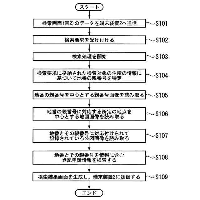 不動産登記申請情報検索装置の処理フローの一例を示す図である。
