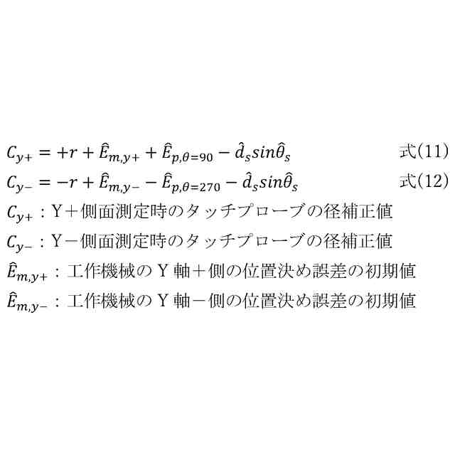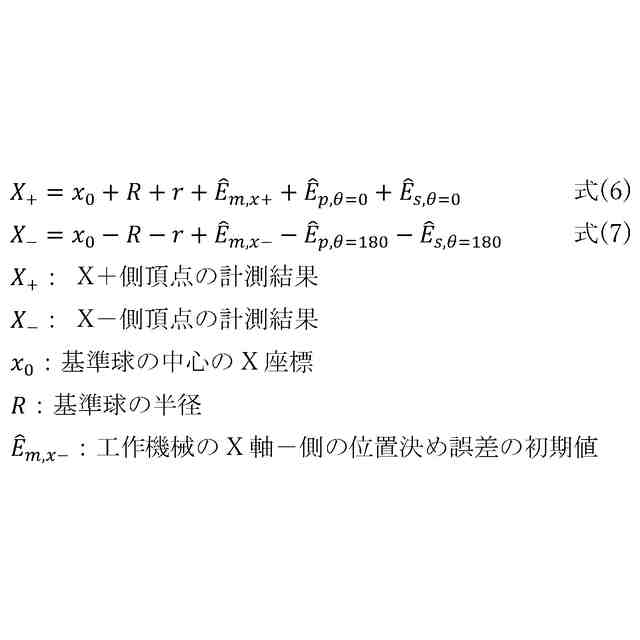 上記目的を達成するために、本発明のうち請求項1に記載の発明は、3軸以上の並進軸と、工具を装着して回転可能な主軸とを有する工作機械において、前記主軸に装着したタッチプローブの補正値の誤差を検査する補正値検査システムであって、前記タッチプローブが装着された前記主軸の割出方向と、前記主軸を前記主軸の軸線に直交する平面内で移動させて前記タッチプローブを所定の被測定物に接触させる接触方向との間の角度を計測角度とすると、複数の前記計測角度において前記タッチプローブにより前記被測定物を計測可能となっており、所定の前記計測角度を第1の基準計測角度とし、当該第1の基準計測角度で初期被測定物を計測した反転前初期計測結果と、前記第1の基準計測角度から180°異ならせた前記計測角度で前記初期被測定物を計測した反転後初期計測結果とにもとづいて、前記主軸の中心に対する前記タッチプローブのスタイラス球中心の位置のずれであるオフセット変位量の初期値を算出する初期オフセット値推定手段と、前記第1の基準計測角度で検査被測定物を計測した反転前検査計測結果と、前記第1の基準計測角度から180°異ならせた前記計測角度で前記検査被測定物を計測した反転後検査計測結果とにもとづいて、前記オフセット変位量の検査時の値を算出する検査時オフセット値推定手段と、前記オフセット変位量の初期値と、前記オフセット変位量の検査時の値とにもとづいて、前記タッチプローブの補正値の誤差を推定する補正値誤差推定手段とを備えていることを特徴とする。