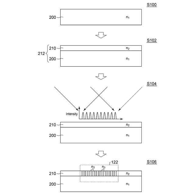 を有するホログラフィック材料210を含む導波路層を形成する(S102)。導波路層のうち、屈折率周期構造122を形成すべき領域を、二光束干渉光によって露光する(122)。これにより干渉パターンに応じた屈折率変化を生じさせ、屈折率周期構造122を得る。