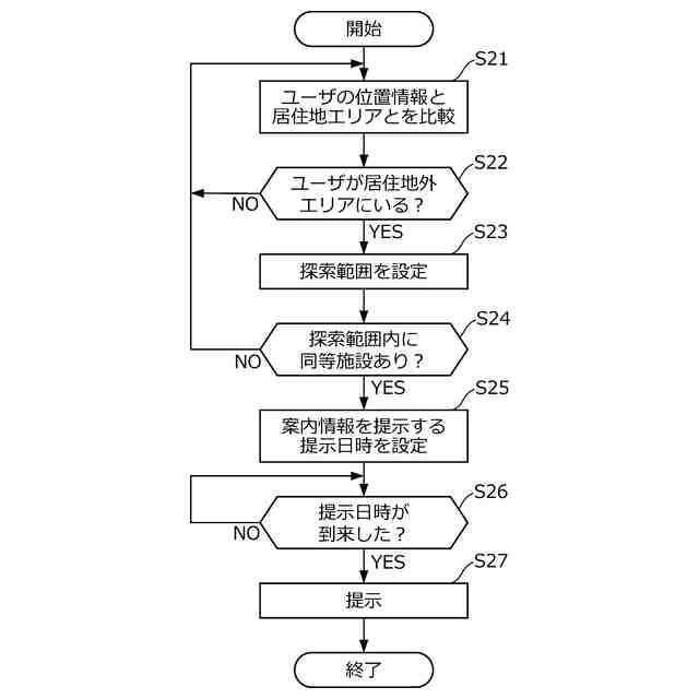 そこで、本発明は、ユーザの旅行先等の居住地外エリアにおいて、そのユーザが居住地エリアでよく訪問している施設と同等の施設をタイミングよく案内することを目的とする。