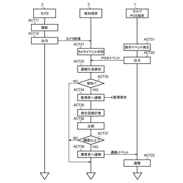 図7は、検知端末における通報行為の検知及び通報に係る動作を、同一レジシステムのカメラ及びセルフPOS端末の動作と併せて説明するための一連のシーケンス図である。