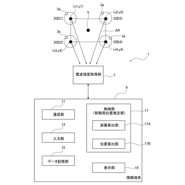 また、各固定局間の基準電波強度は、固定局のそれぞれに設けられた送受信アンテナが各地点で順次受信する、他の固定局に設けられた送受信アンテナの各地点から順次送信される電波の受信強度が平均されて、取得される。各固定局に設けられた送受信アンテナは、領域内の所定の位置座標を中心に所定の半径で回転し、送信側では、少なくとも3地点以上の各回転位置で他の固定局へ向けて順次電波が送信され、受信側では、少なくとも3地点以上の各回転位置で他の固定局から送信される電波が順次受信される。したがって、各固定局間の基準電波強度は、受信側の送受信アンテナの平均位置と送信側の送受信アンテナの平均位置との間の距離に対して対数領域において比例した安定したものとなる。